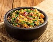 Farinha de mandioca + Linguiça Calabresa + temperos + Salça e cebolinha.